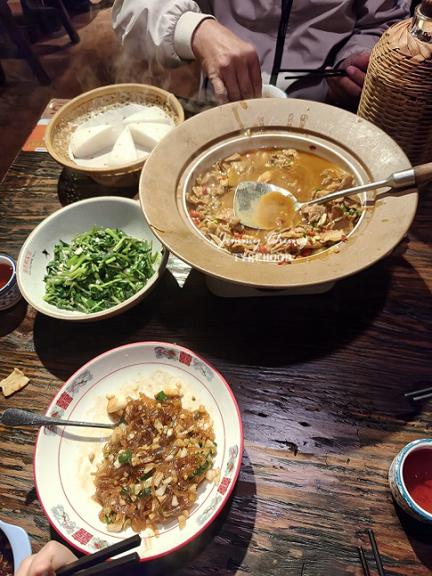 值得一試的菜餚包括魚湯、岩耳雞湯、蒿子粑粑。岩耳的外觀與口感都類似黑木耳。據說它生長在野外的懸崖周邊(無法人工栽培),而且營養豐富。